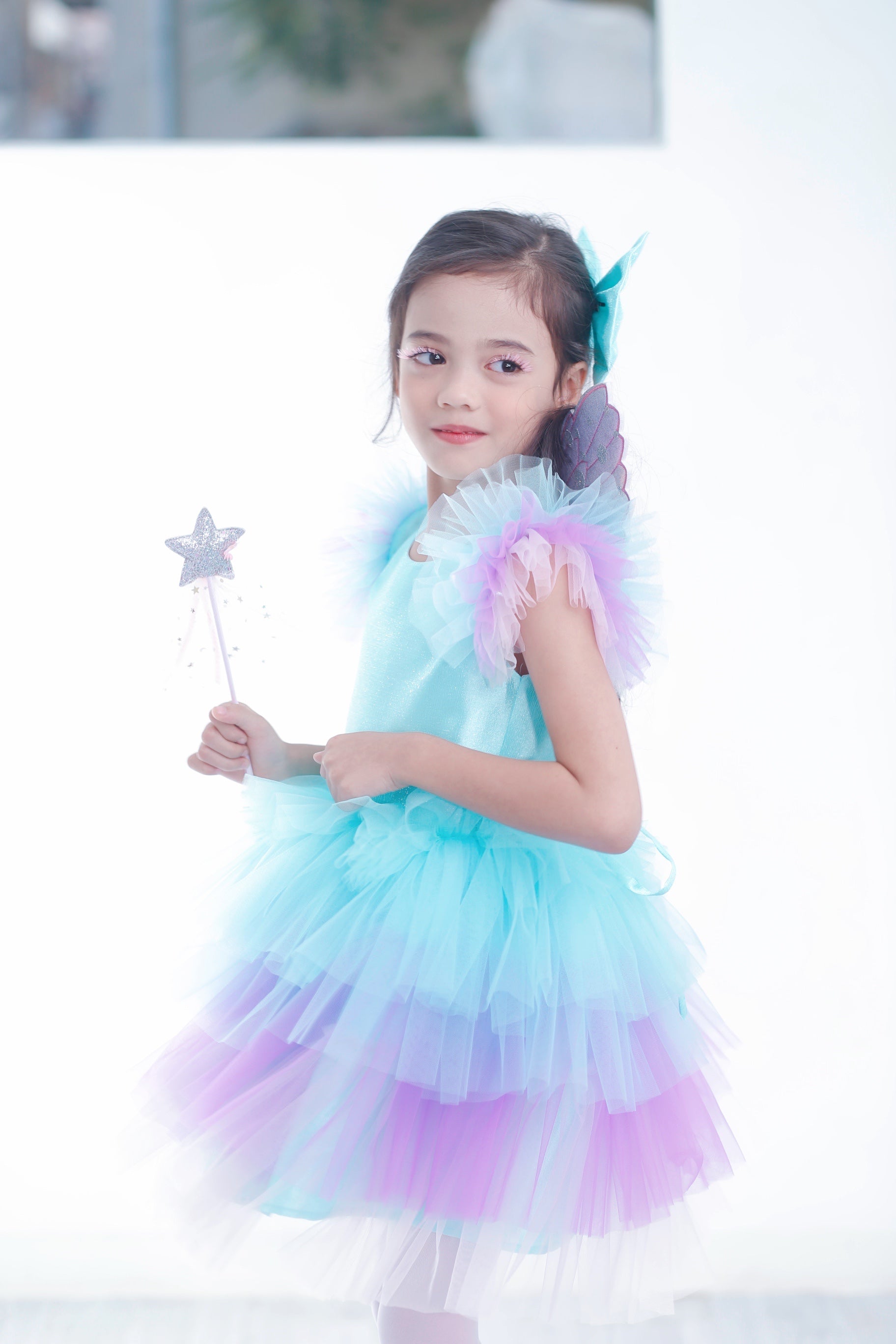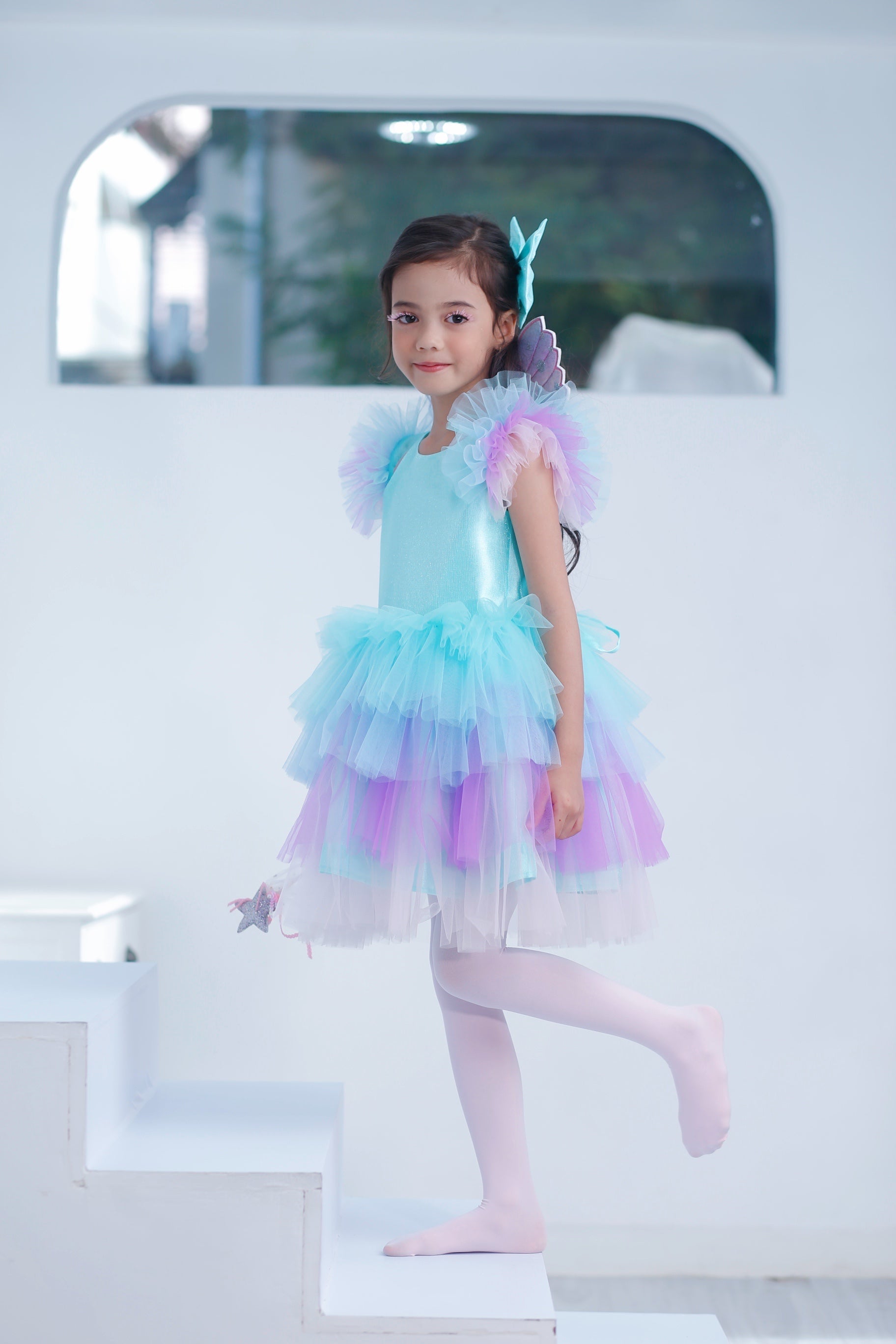 - Sparkling aqua bodice with multi-layered pastel tulle skirt