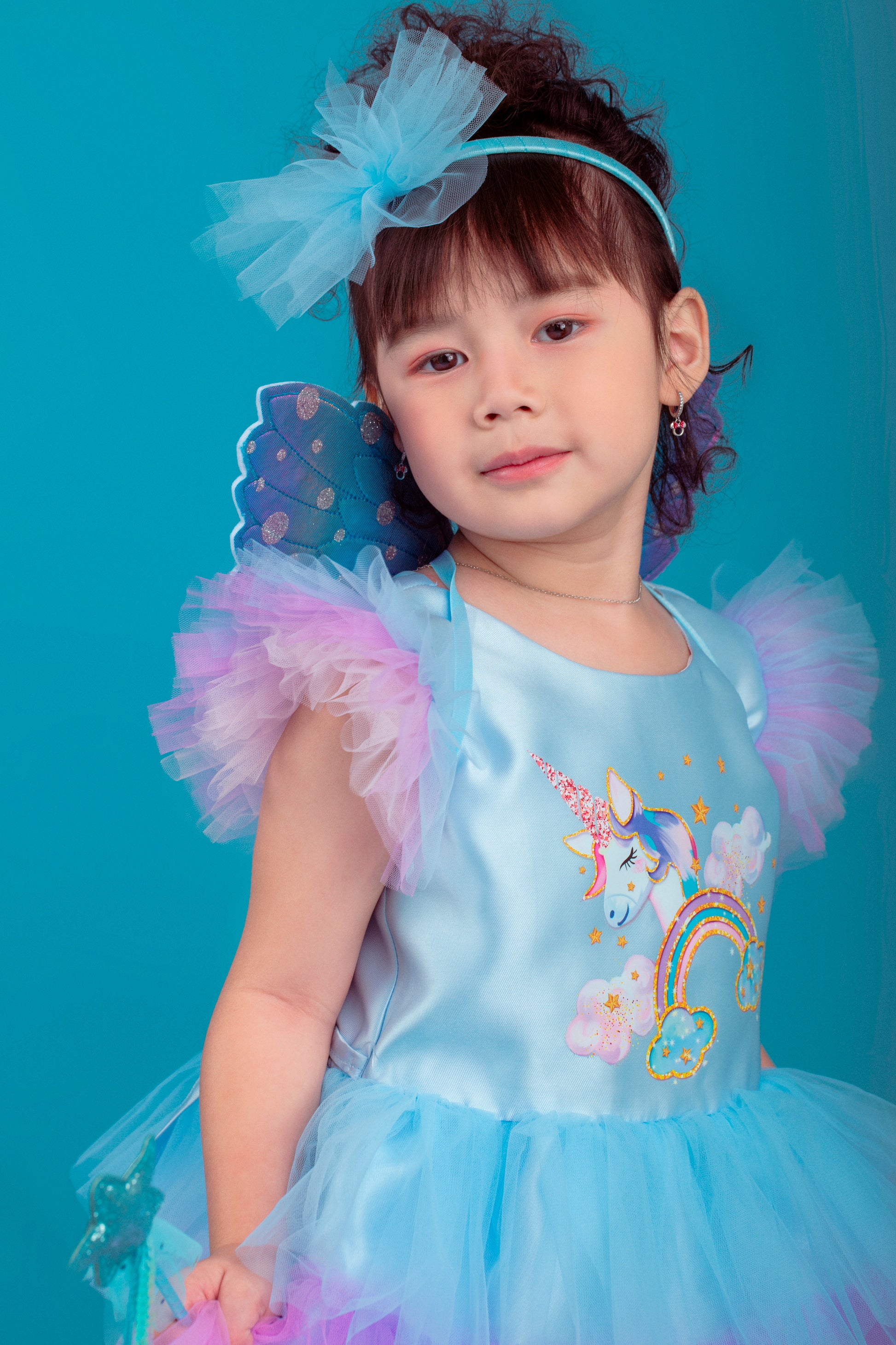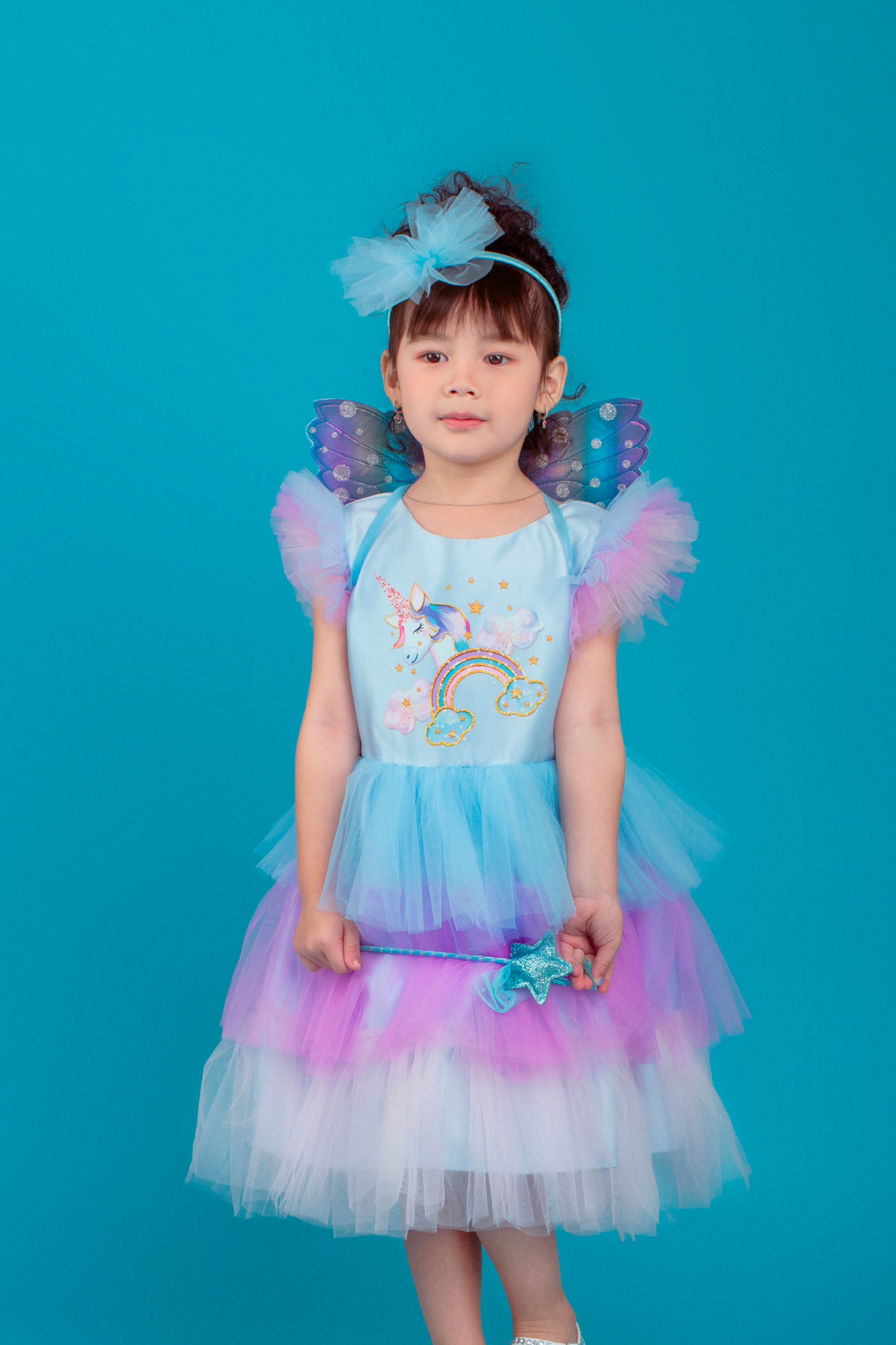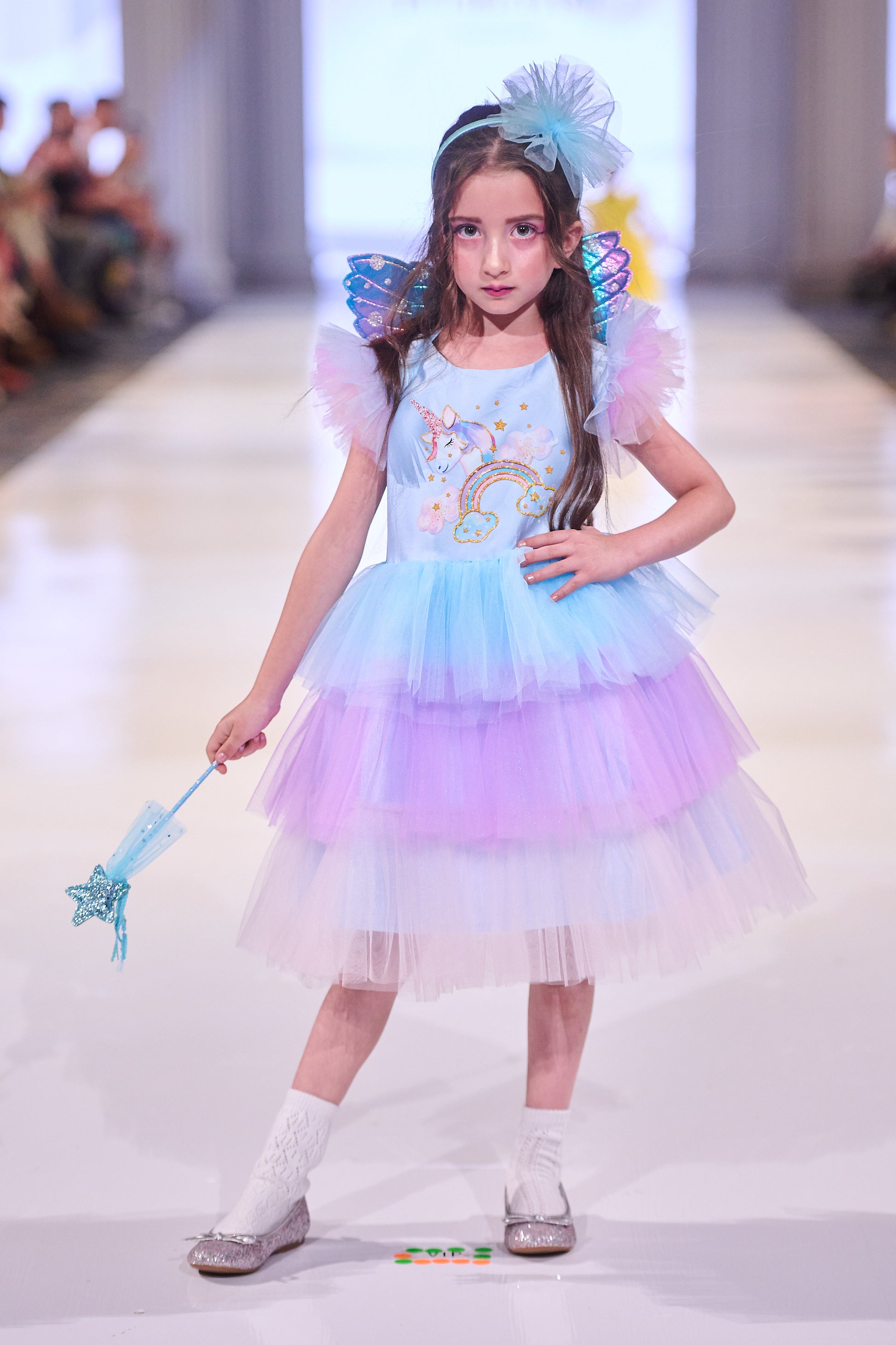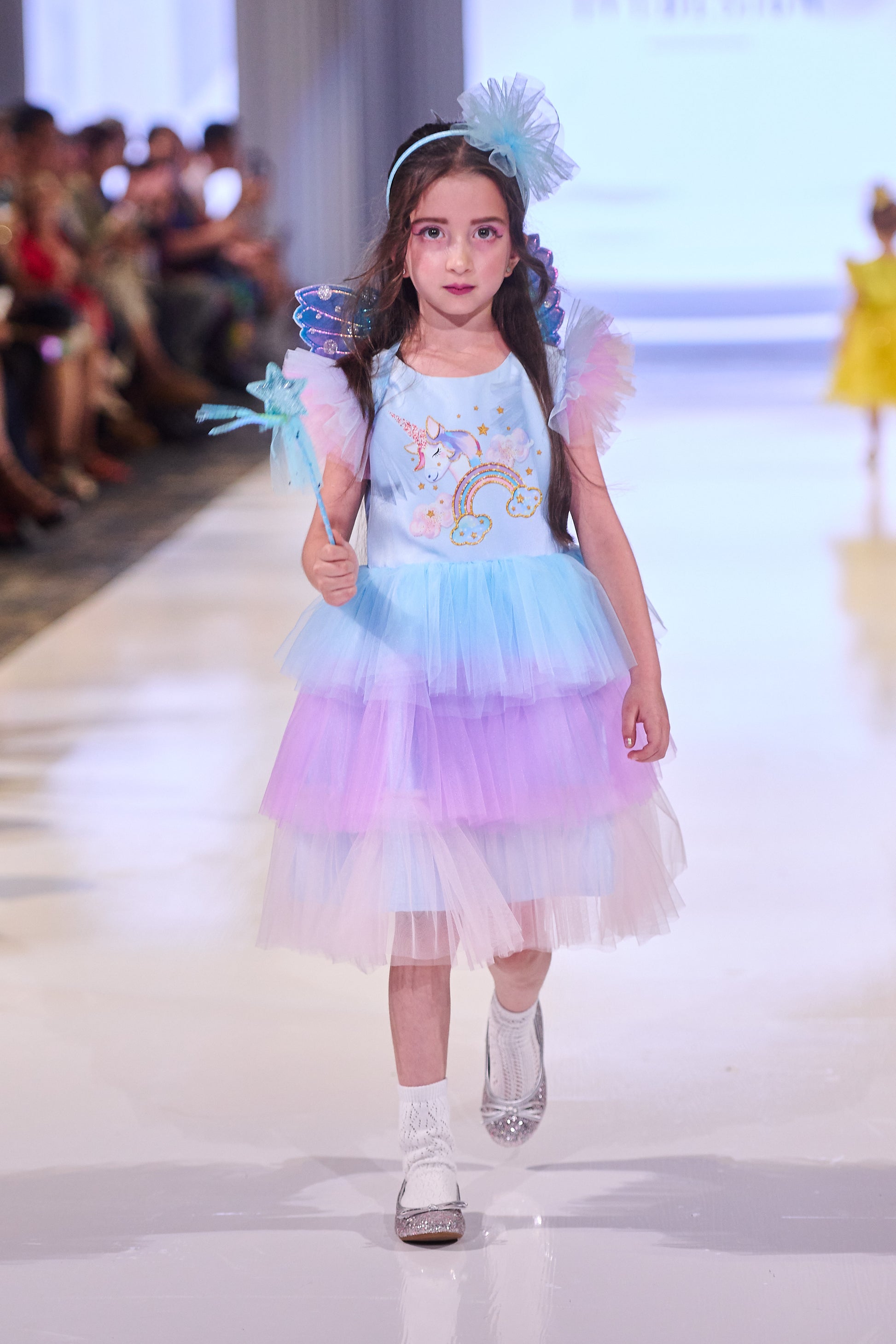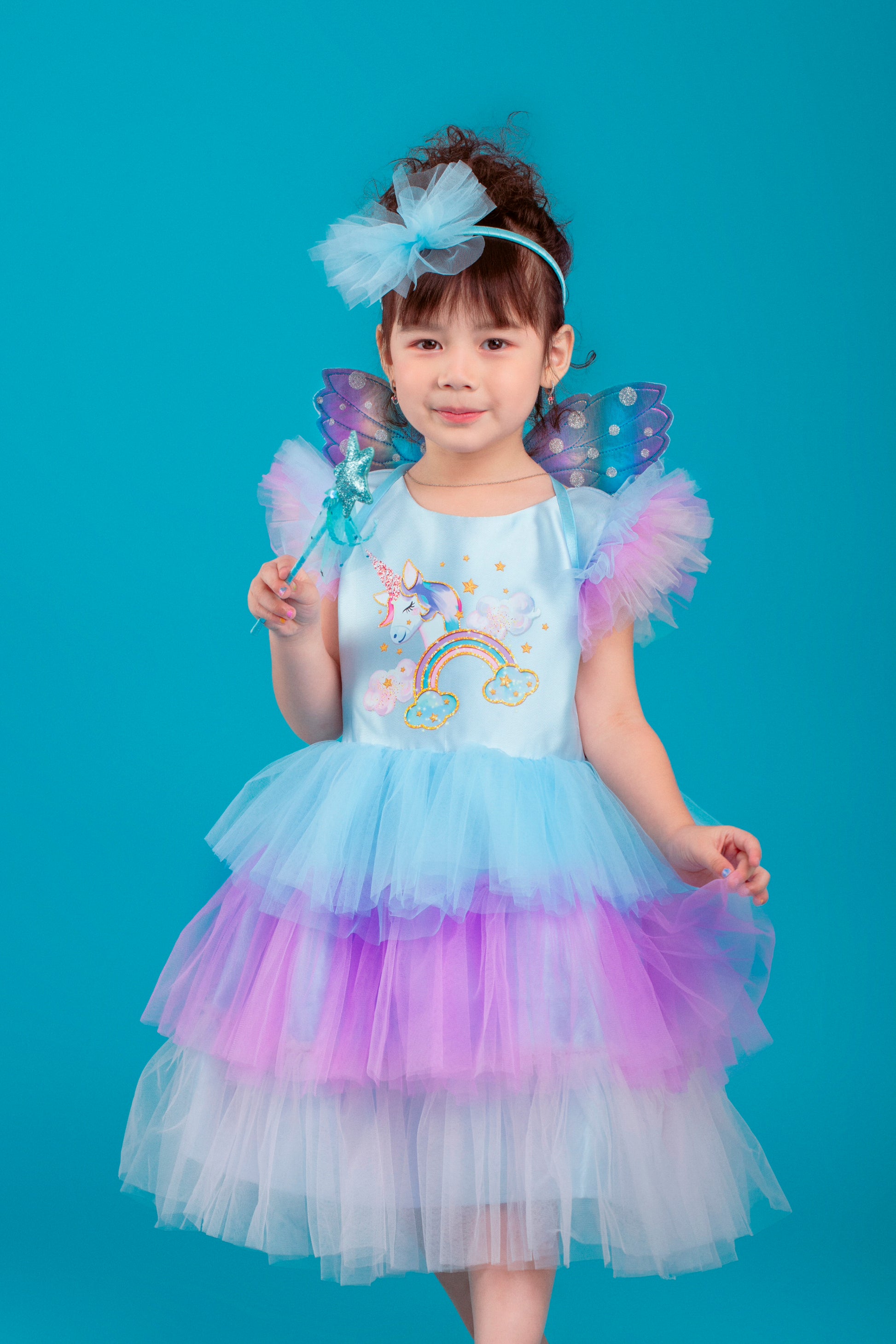 - Whimsical pastel dress featuring a satin bodice with unicorn and rainbow print